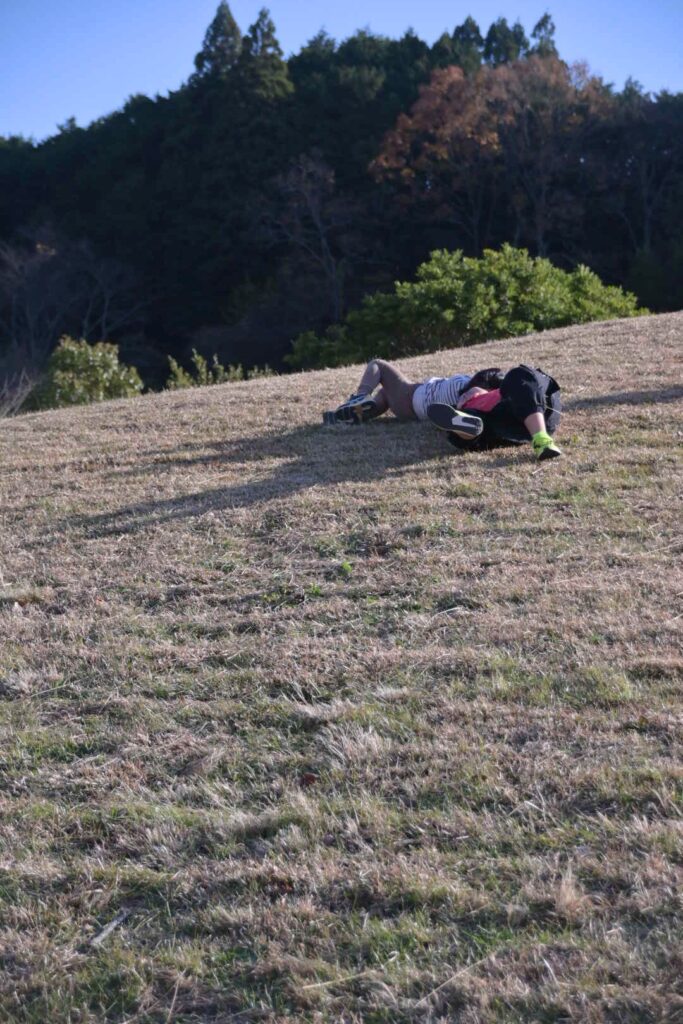 これがまた中々の角度でして、寝転んで転がったら結構なスピードで転がり落ちていくんです。